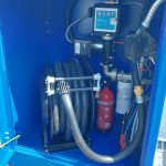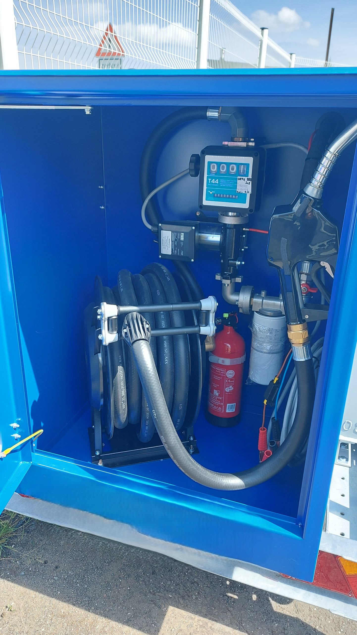 Součástí přívěsu je v zadní části umístěná ocelová uzamykatelná skříňka s čerpadlem: